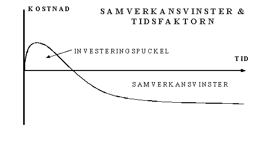 Som vi ser av figuren leder att samverkansarbete inledningsvis till en kostnadsökning, en form av investeringspuckel som ofta sträcker sig över en period om kanske 6-18 månader. Samverkansvinsterna inträffar först i ett andra skede, men är i regel desto större och sträcker sig över en längre tidsperiod.