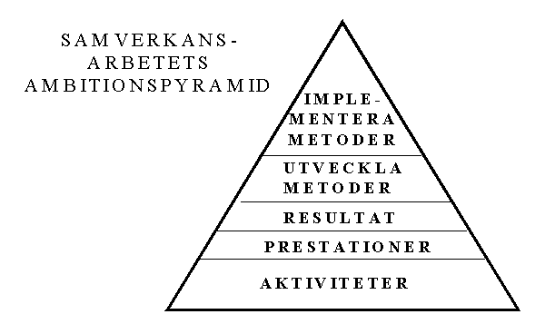Jag tror nämligen att en ännu högre satt ambitionsnivå i ett samverkansarbete är att utveckla metoder, dvs. att hitta konkreta arbetsformer och arbetsmetoder med vars hjälp man kan lösa problem. På detta sätt blir metodutveckling ett redskap för att i större skala, utanför det konkreta samverkansprojektet, komma vidare i samverkansprocessen.
