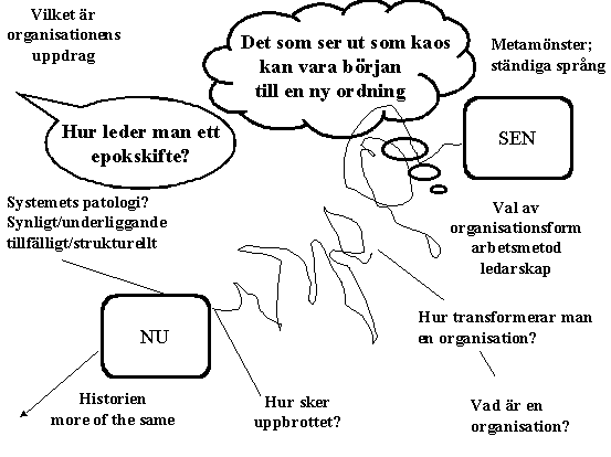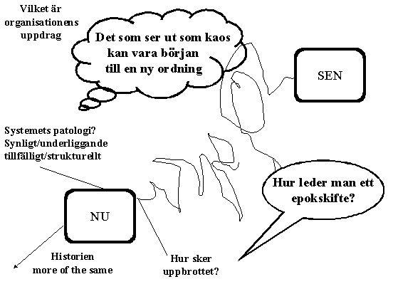 En bit in i vårt resonemang kan du på nytt vara meningsfullt att formulera ytterligare ett antal frågor som kräver svar; vilken ny ordning är dagens kaos början till? Hur ska vi kunna släppa more of the samemodellen för problemlösning? Hur ska jag som ledare kunna skapa förutsättningar för och leda uppbrottet?