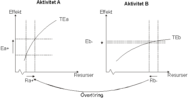 Detta samband kan man kalla en produktionsfunktion, där sambandet mellan inputs (resurser) och output (effekt) ställs upp. Detta har vi gjort för två hypotetiska och hårt stiliserade verksamheter – aktivitet A och B i diagrammet ovan. I extrema fall som ovan kan man tänka sig en ordentlig utväxling på att flytta över ett visst belopp från den ena till den andra verksamheten. Tanken är att om man flyttar över Rb- kronor till verksamhet A – dvs Ra+ så kommer detta att resultera i en positiv totaleffekt. Det innebär att effekten av en ökning av verksamhet A är betydligt större än effektminskningen som uppstår på grund av att verksamhet B minskar.