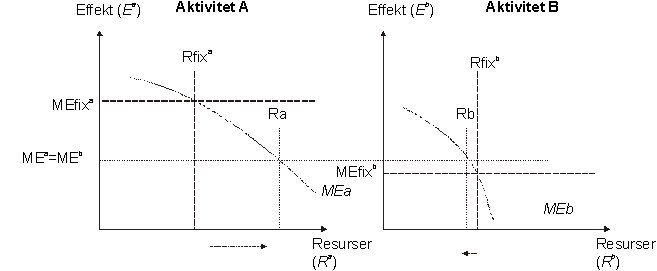För att illustrera marginalsambanden, tänker vi oss i utgångsläget att vi har en viss resurstilldelning i de bägge verksamheterna. Låt oss för enkelhets skull anta att den är lika stor, dvs Rfixa=Rfixb. Vid denna resurstilldelning är effekterna av verksamheterna MEfixa respektive MEfixb, och verksamheten i A ger betydligt större utdelning på marginalen.